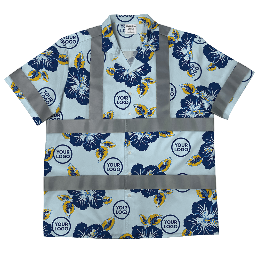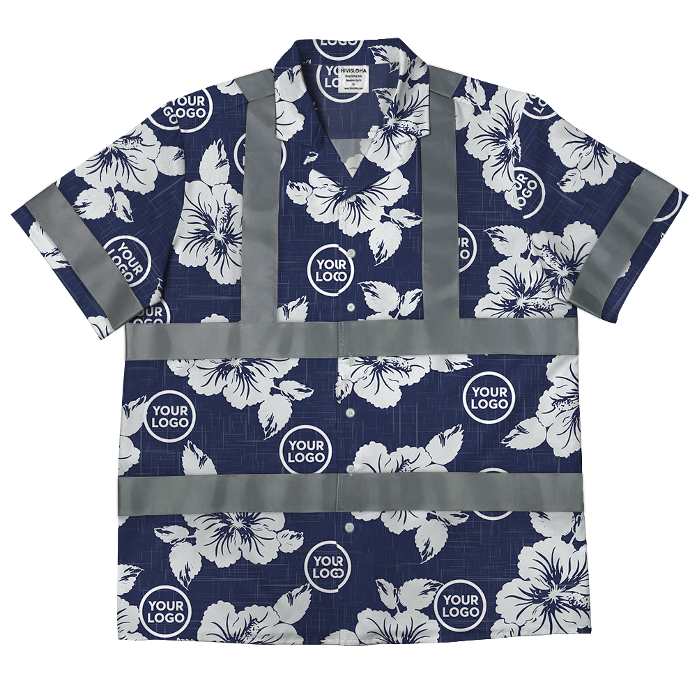 Blue Navy Hibiscus Safety Hawaiian Shirt With Custom Logo